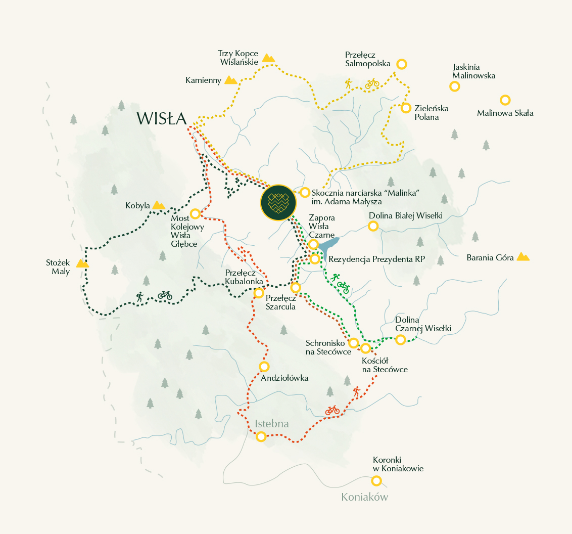 Pokonując tę trasę zdobędziemy drugi co do wielkości szczyt w Wiśle, popularny, wyjątkowy Stożek z najstarszym schroniskiem. Przy zjeździe można lekko zboczyć ze szlaku, żeby obejrzeć wiślańską, naturalną ściankę wspinaczkową. Następny ciekawy przystanek na Groniu, gdzie rozpościera się piękna panorama. Jedno z najbardziej widokowych miejsc w całej Wiśle. Bardzo popularne.