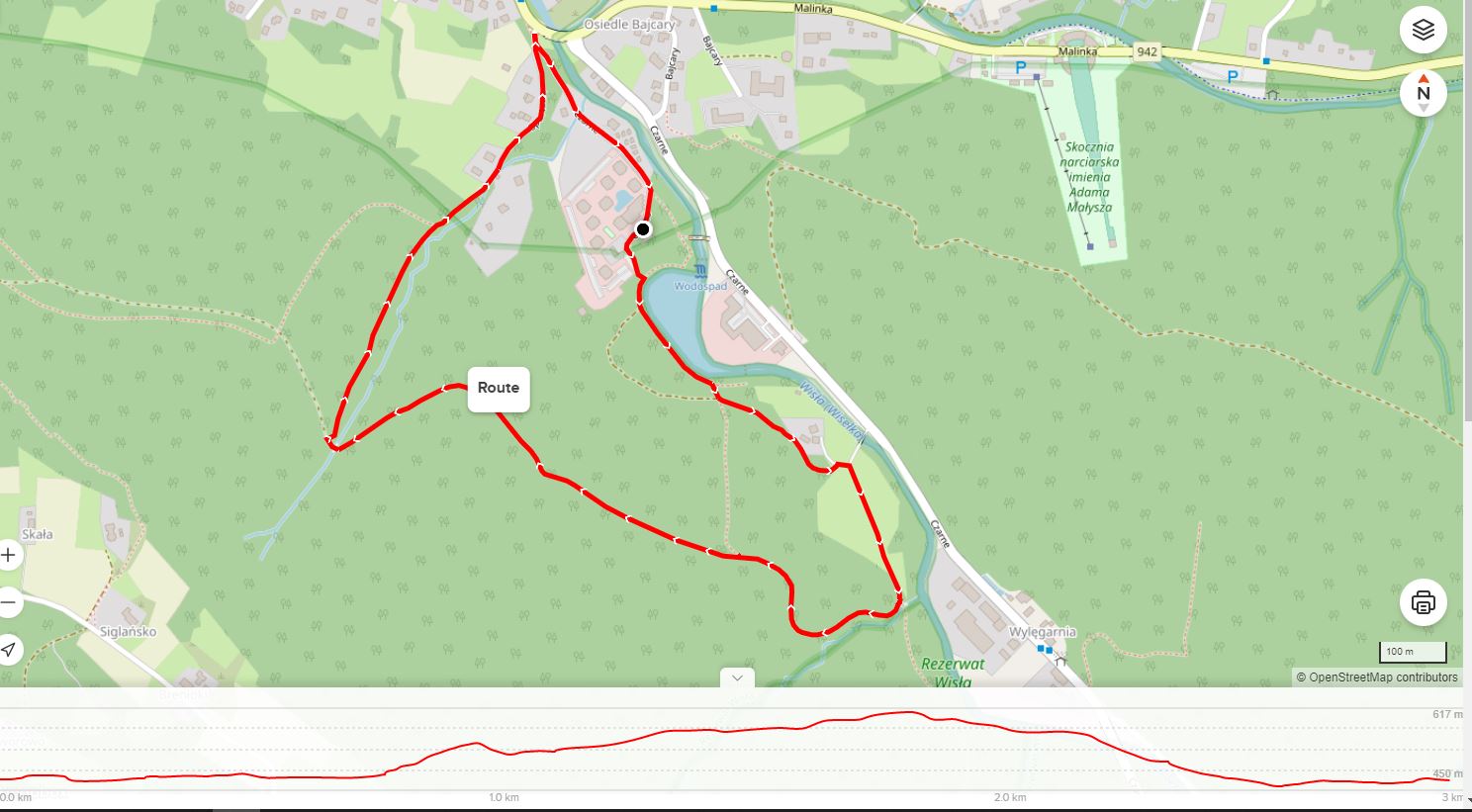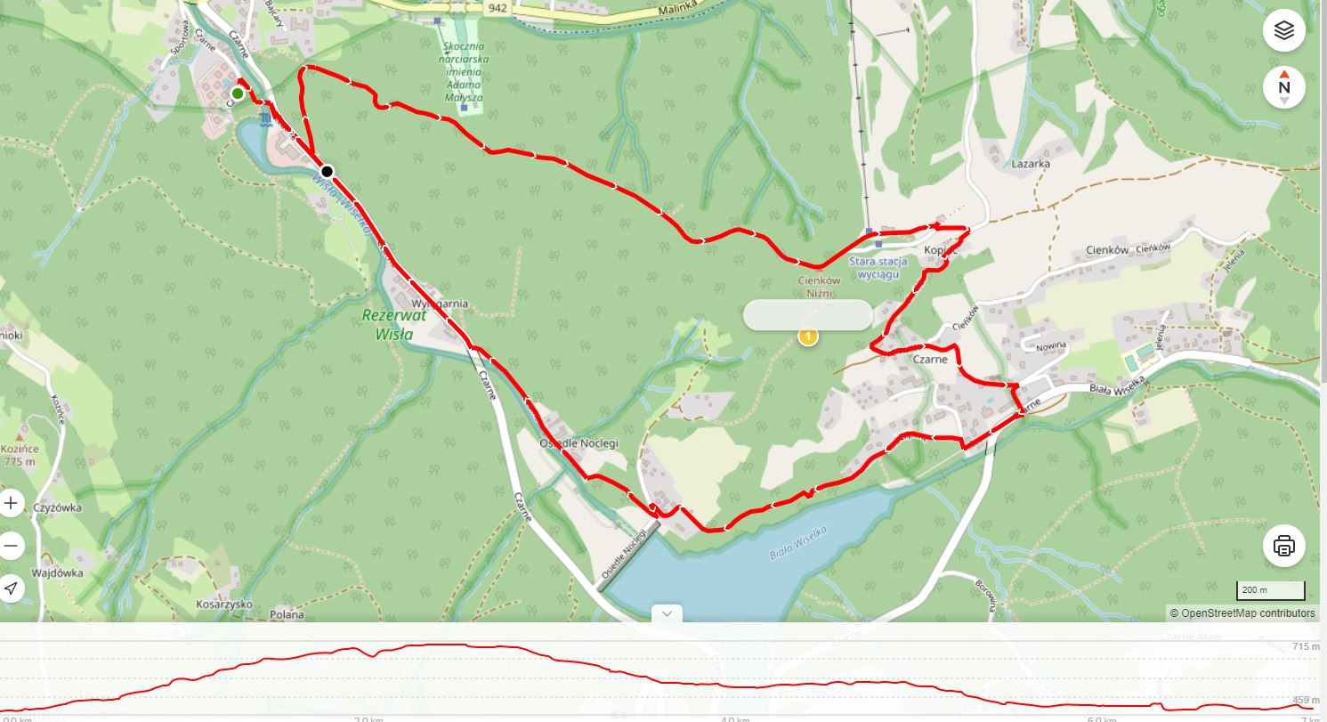 Trasa obfitująca w piękne widoki na gronie Beskidu Śląskiego. Jest to trasa górska, która choć nie jest bardzo wymagająca pozwoli nam oraz naszemu pupilowi trochę się zmęczyć. Po drodze będziemy mijać dwie karczmy, w których możemy odpocząć oraz się posilić. Za drugą karczmą skręcamy w prawo na drogę asfaltową na Czarne i cały czas trzymamy się prawej strony, po lewej stronie najpierw będziemy mieli potok Biała Wisełka, a następnie zaporę w Wiśle Czarnem wraz z tarasem widokowym z którego roztacza się przepiękny widok na tzw. Jezioro Czerniańskie, po dojściu do deptaka nad zaporą mijamy go po lewej stronie i kierujemy się na leśną ścieżkę, którą dotrzemy do Nadleśmictwa Wisła, z którego już asfaltem, a później chodnikiem dotrzemy wprost do VISLOW Resort.