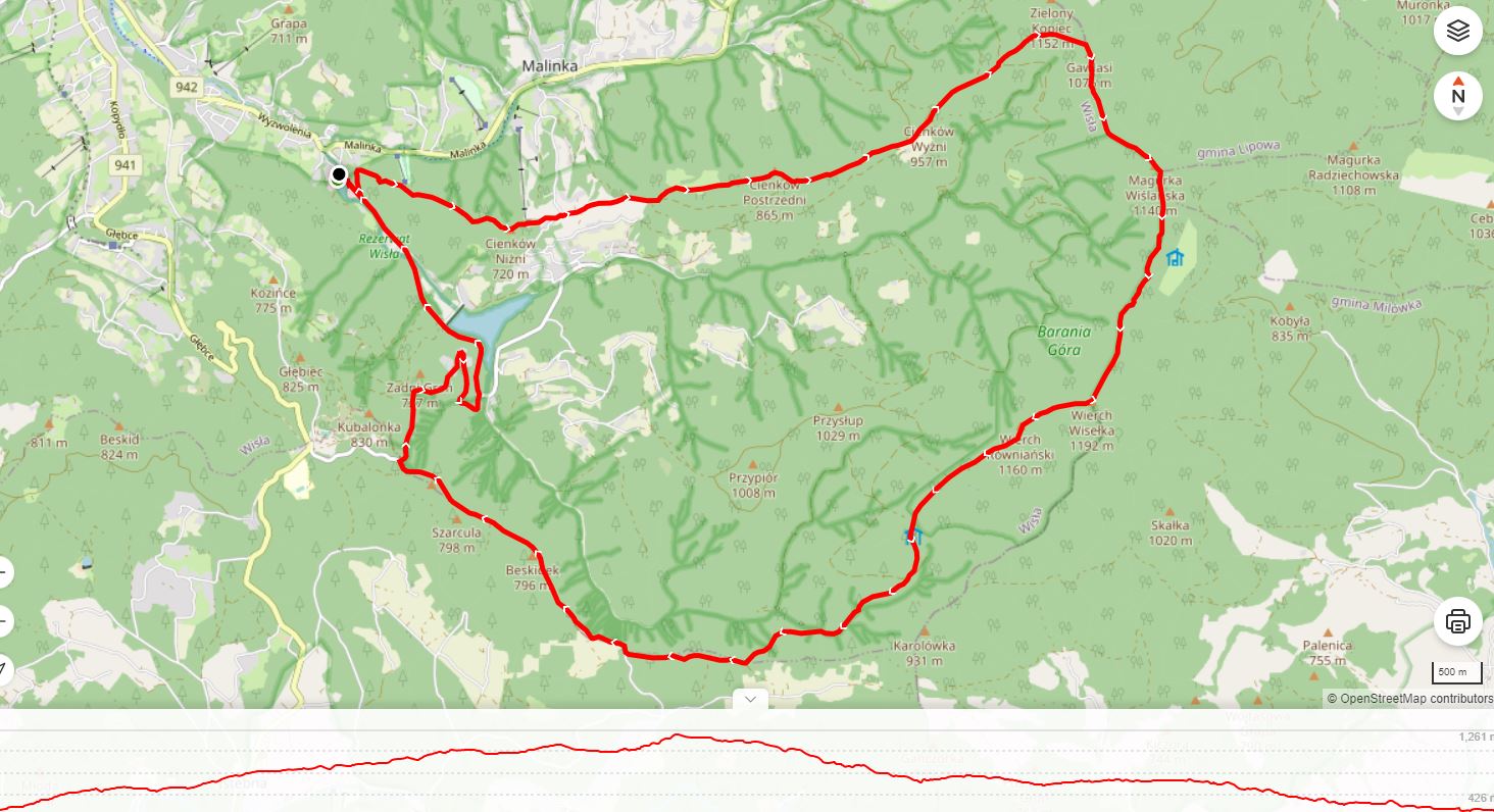 Wyjście rozpoczynamy żółtym szlakiem na Cieńków, którym będziemy wędrowali aż 11 km do Zielonego Kopca, następnie zielonym szlakiem na Baranią Górę, z Baraniej Góry również szlakiem zielonym (do którego dołącza także czerwony) do polany Przysłop ze schroniskiem. Zejście ze schroniska szlakiem czerwonym. Mamy tutaj dwie możliwości, wędrować cały czas czerwonym aż do Kubalonki lub w momencie dojścia do asfaltu wybrać drogę asfaltową (na naszej mapce przedstawimy opcję z zejściem asfaltem ponieważ jest krótsza o ok. 3 km) dochodzimy do rozwidlenia dróg i kierujemy się w dół wprost do Zameczku Prezydenta i cały czas asfaltem aż do VISLOW Resort.
