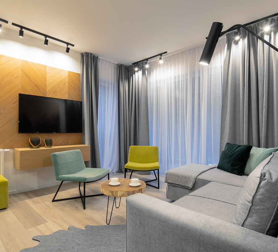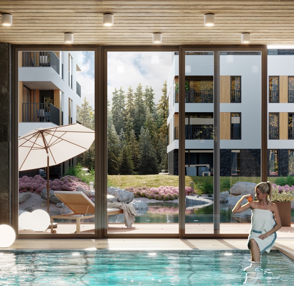 Przestrzeń, światło i funkcjonalność – to trzy najważniejsze cechy naszych apartamentów. Przestrzeń wynika z powierzchni, która wynosi od 33 do 60m2. Światło dają duże okna oraz przeszklone tarasy z widokiem na lasy wiślańskie. O funkcjonalność zadbaliśmy dodając do każdego apartamentu aneks kuchenny z jadalnią. Komfort Gości jest dla nas najważniejszy.